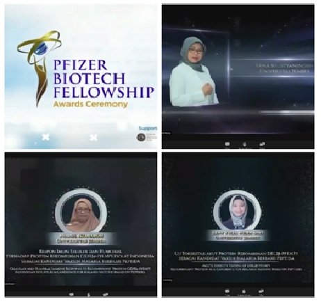 Penghargaan “Pfizer Biotech Fellowship Award Ceremony” dilakukan secara daring yang dihadiri oleh Menteri Kesehatan Republik Indonesia Bapak Budi Gunadi Sadikin dan Dirjen Pendidikan Tinggi, Riset dan Teknologi, Prof. Ir. Nizam, M.Sc., DIC., PhD., IPU. Asean Eng. Dalam kesempatan lain Koordinator Program Studi Magister Bioteknologi, Prof. Tri Agus Siswoyo menyambut gembira dengan terpilihnya 2 mahasiswa PS Magister Bioteknologi sebagai penerima Graduate Research Award berupa pembiayaan penyelesaian penelitian tesis, semoga prestasi kedua mahasiswa ini menjadi inspirasi dan penyemangat mahasiswa Magister Bioteknologi lainnya dan mengharumkan nama almamater.