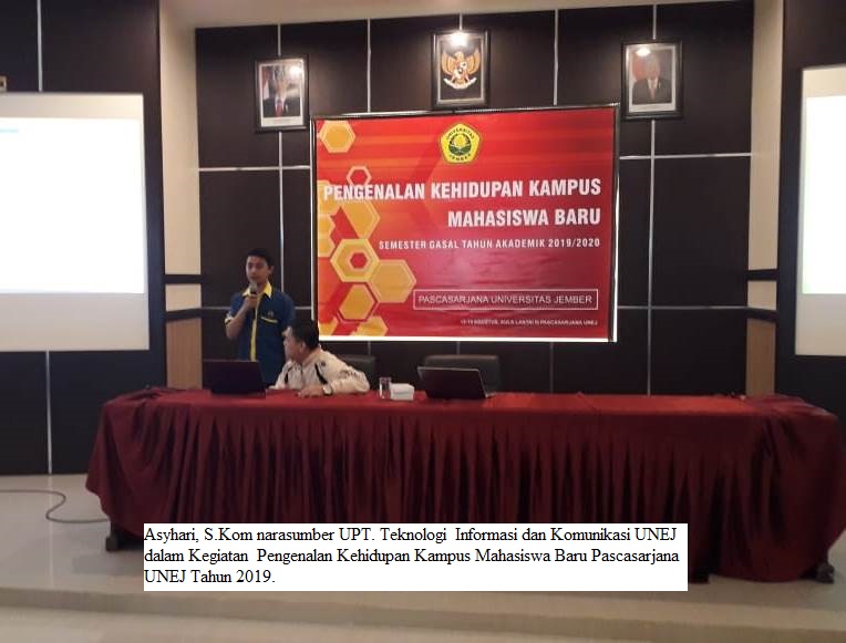 Hal ini disampaikan oleh Asyhari, S.Kom narasumber UPT. Teknologi Informasi dan Komunikasi UNEJ disela-sela kegiatan Pengenalan Kehidupan Kampus Mahasiswa Baru Pascasarjana UNEJ (14/8/2019) bertempat di Gedung Pascasarjana UNEJ