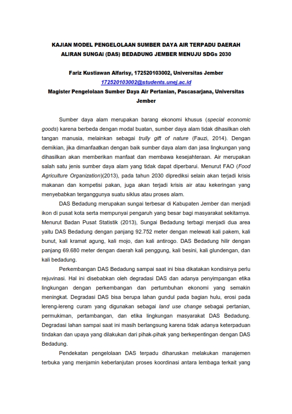 KAJIAN MODEL PENGELOLAAN SUMBER DAYA AIR TERPADU DAERAH ALIRAN SUNGAI (DAS) BEDADUNG JEMBER MENUJU SDGs 2030
