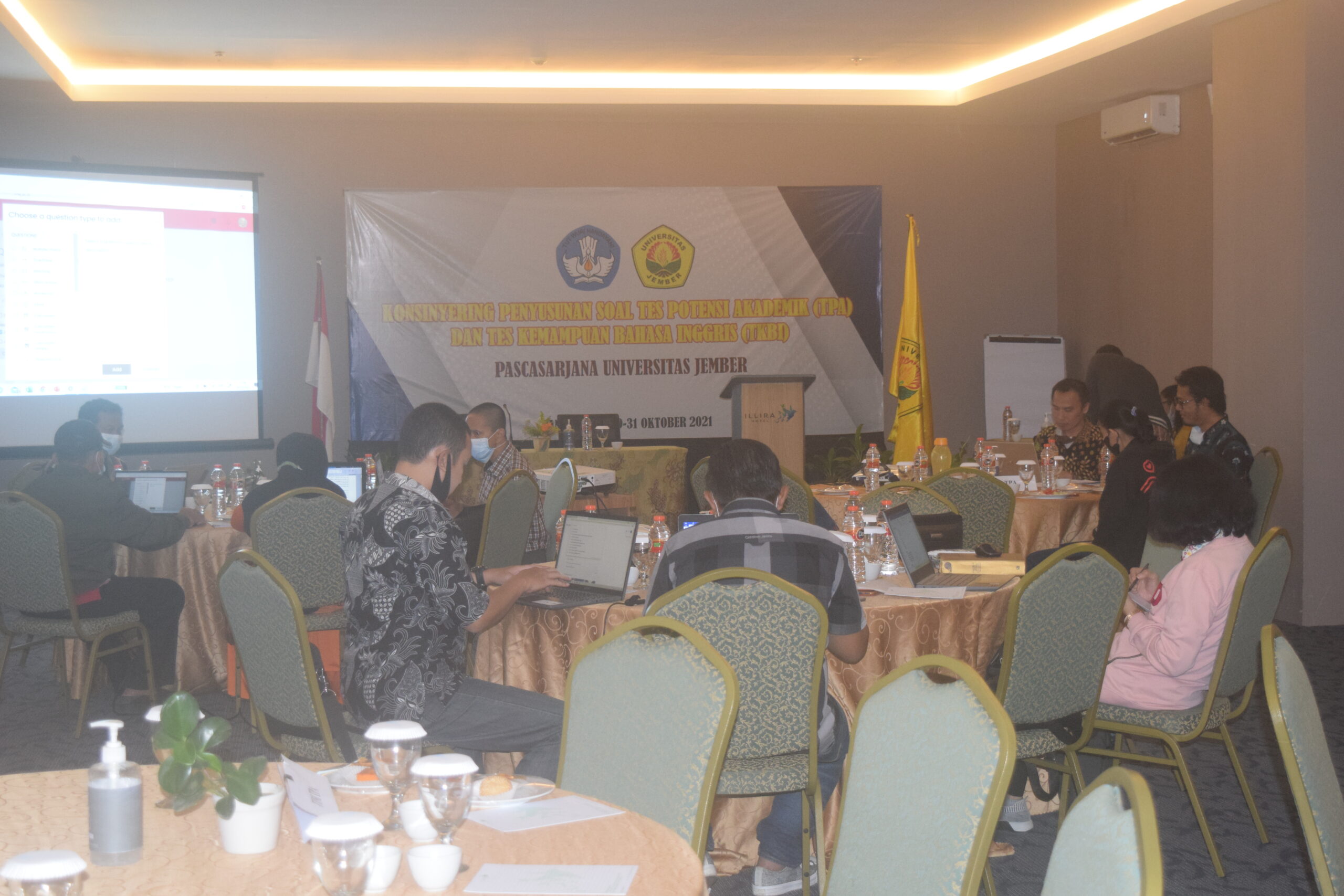 Pascasarjana Universitas Jember mengadakan kegiatan Konsinyering Penyusunan Soal Tes Potensi Akademik (TPA) dan Tes Kemampuan Bahasa inggris (TKBI) yang dihadiri Wakil Direktur I Prof. drg. Mei Syafriadi, Ph.D dan Wakil Direktur II Prof. Dr. M. Arief Amrullah, S.H., M.Hum selama tiga hari (29-31 Oktober 2021) bertempat di Hotel Illira Banyuwangi yang diikuti oleh Penyusun soal ( Prof. Drs. I Made Tirta, M.Sc., Ph.D., Dra. Anastasia Erna Rochiyati Sudarmaningtyas, M.Hum., Dr. Erfan Yudianto, S.Pd., M.Pd., dan Dr. Aan Erlyana Fardhani, M.Pd.), Fasilitator ( Dr. Ir. Bambang Marhaenanto, M.Eng., Arif Fatahillah, S.Pd., M.Si., Agung Nugroho Puspito, SPd., M.P., Ph.D., Moh. Fadil, S.Pd. dan Ilzam Mahfudurido, S.Pd., M.Li.)  dan Tendik Pascasarjana Universitas Jember.