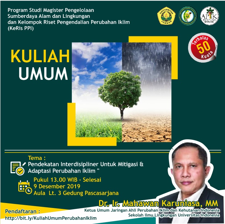 Pendaftaran Peserta Kuliah Umum Perubahan Iklim December 5, 2019Category: PENGUMUMANComments Off on Pendaftaran Peserta Kuliah Umum Perubahan IklimPendaftaran silahkan buka link berikut: http://bit.ly/KuliahUmumPerubahanIklim