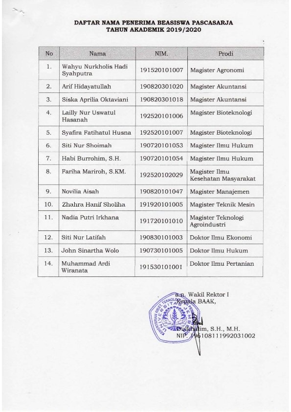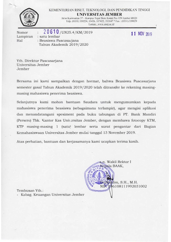 Pengumuman Bagi Penerima Beasiswa Pascasarjana UNEJ November 15, 2019Category: PENGUMUMANComments Off on Pengumuman Bagi Penerima Beasiswa Pascasarjana UNEJ