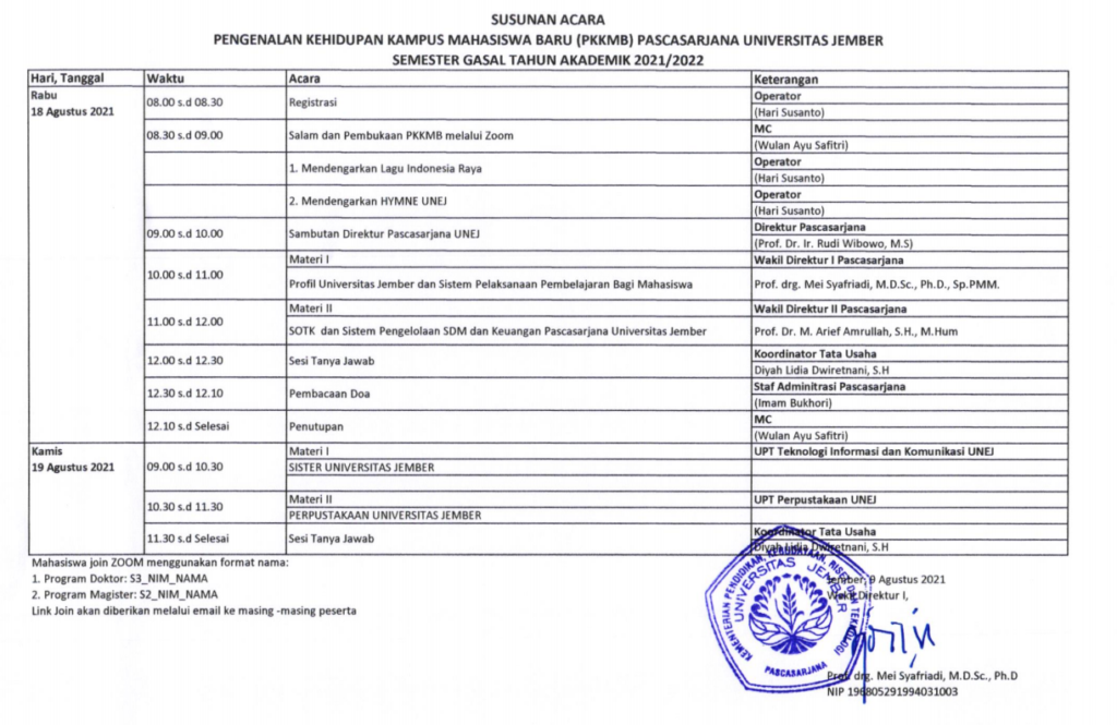 Pengumuman Jadwal Pengenalan Kehidupan Kampus Mahasiswa Baru (PKKMB) Pascasarjana Universitas Jember Semester Gasal T.A 2021/2022
