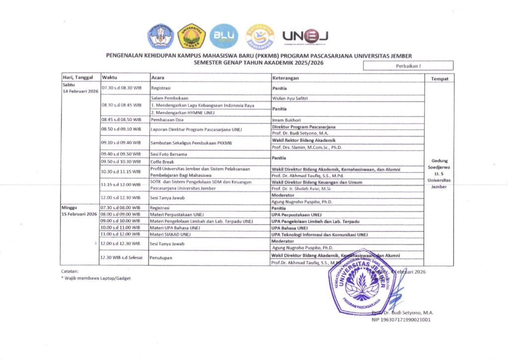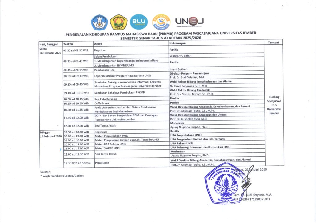 Pengumuman PKKMB Program Pascasarjana Universitas Jember Semester Genap Tahun Akademik 2025/2026 January 26, 2026Category: PENGUMUMANComments Off on Pengumuman PKKMB Program Pascasarjana Universitas Jember Semester Genap Tahun Akademik 2025/2026