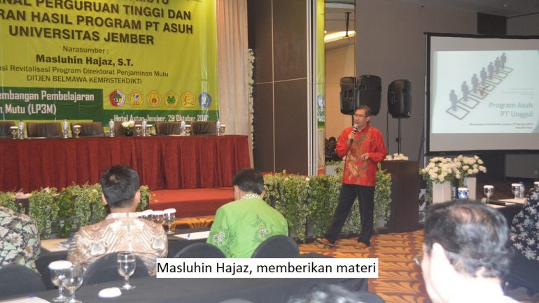 Mutu menjadi hal yang tidak bisa ditawar-tawar dalam pengelolaan sebuah perguruan tinggi. Bahkan Kementerian Riset, Teknologi, dan Pendidikan Tinggi (Kemenristekdikti) telah mengambil langkah tegas menutup perguruan tinggi yang tidak memenuhi standar yang ditetapkan, dan atau melanggar aturan. Oleh karena itu Kemenristekdikti saat ini berusaha keras meningkatkan mutu perguruan tinggi di Indonesia dengan berbagai cara dan program. Salah satunya dengan Program Asuh. Pendek kata bagi perguruan tinggi, pilihannya bermutu atau mati ! Peringatan ini disampaikan oleh Masluhin Hajaz, Kepala Seksi Revitalisasi Program, Direktorat Penjaminan Mutu Direktorat Jenderal Pembelajaran dan Kemahasiswaan (Belmawa), Kemenristekdikti, saat memberikan materi dalam kegiatan seminar Penjaminan Mutu Internal Perguruan Tinggi, sekaligus Laporan Hasil Program Asuh Universitas Jember di Hotel Aston, Jember (29/10).