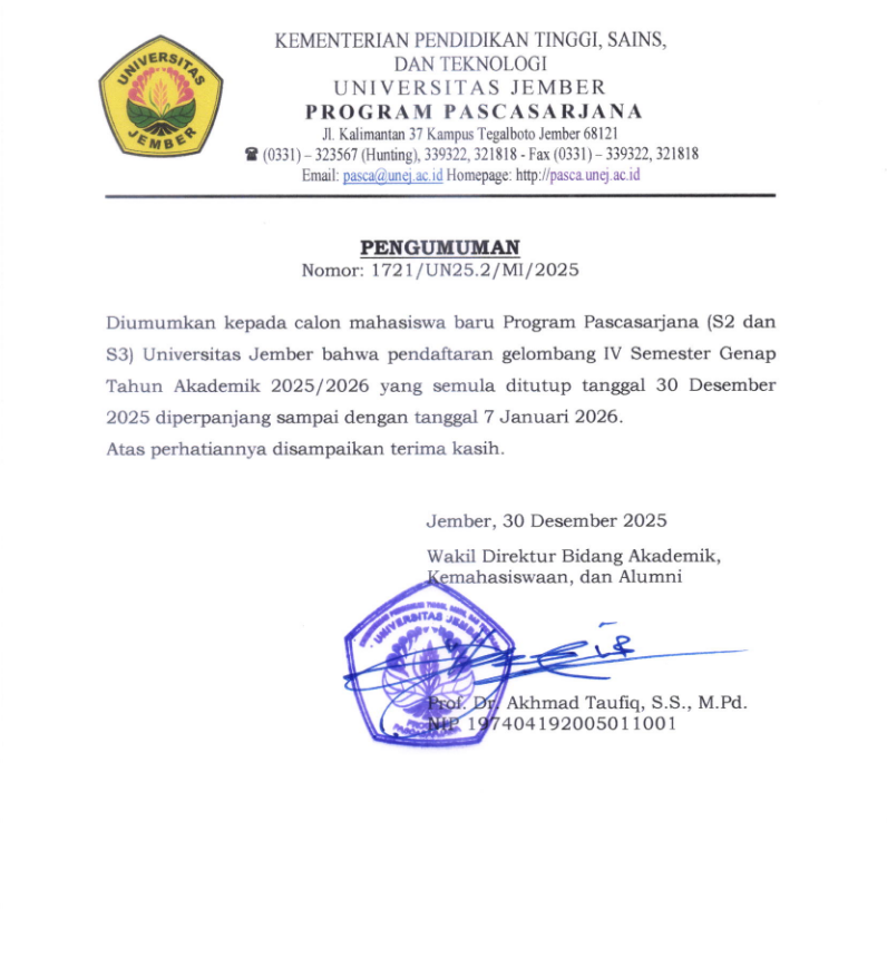 Perpanjangan Pendaftaran Penerimaan Mahasiswa Baru Gel. IV Semester Genap T.A 2025/2026 December 30, 2025Category: PENGUMUMANComments Off on Perpanjangan Pendaftaran Penerimaan Mahasiswa Baru Gel. IV Semester Genap T.A 2025/2026