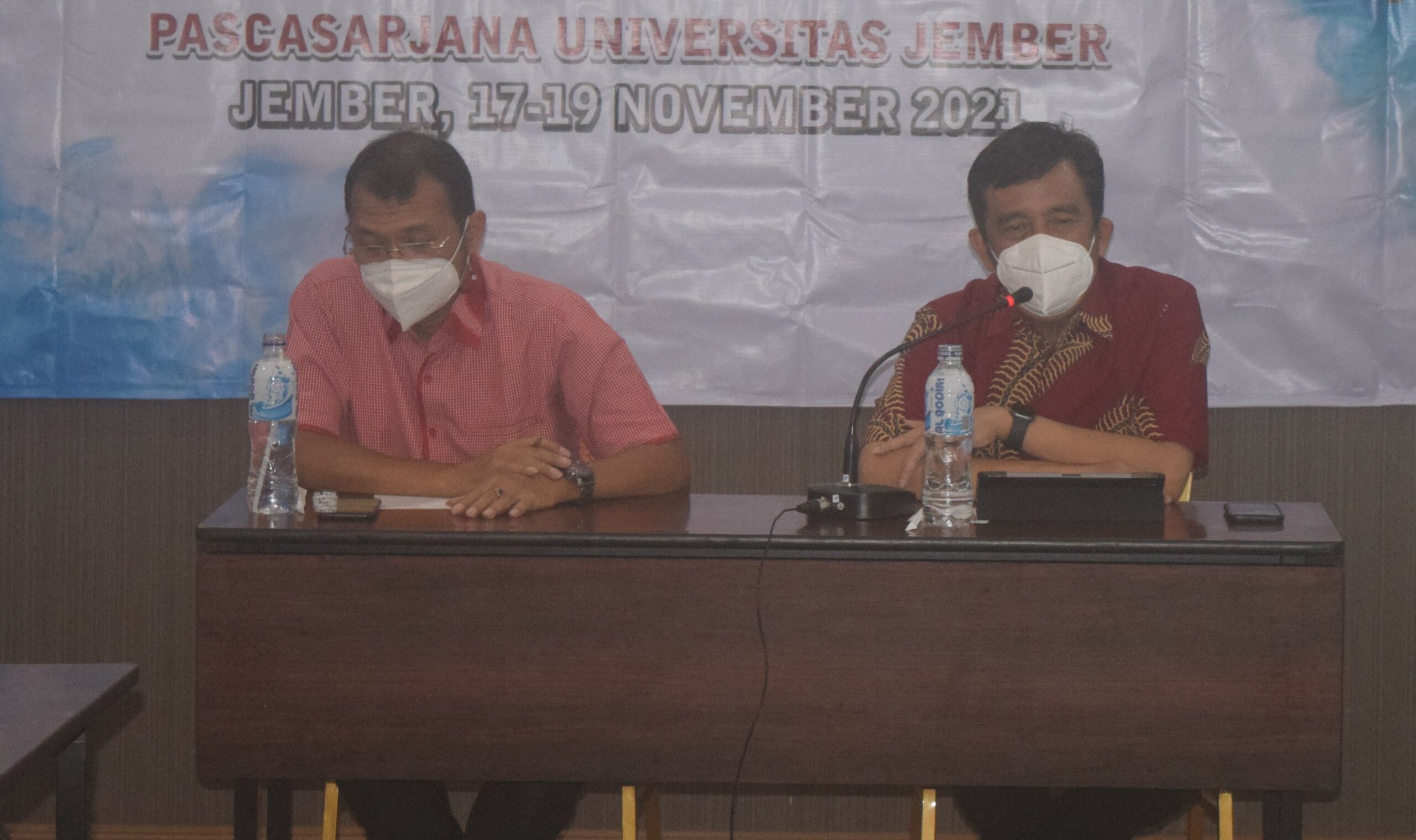 Wakil Rektor I Universitas Jember Prof. Drs. Slamin, M.Comp.Sc., Ph.D. didampingi Wakil Direktur I Pascasarjana Prof. drg. Mei Syafriadi, M.D.Sc., Ph.D., memberikan sambutan sekaligus membuka acara.
